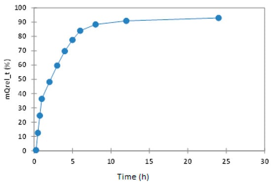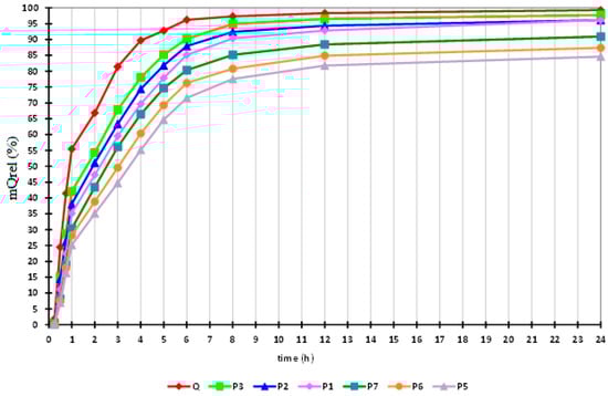 The experimental data obtained are presented in Table S14 in the Supplementary Materials and in Figure 11, and confirm that in all samples, more than 36% of the active substance was released in first hour, with this quantity reaching 69% after 4 h, and around 88.35% of entrapped QUE having been released after 8 h.