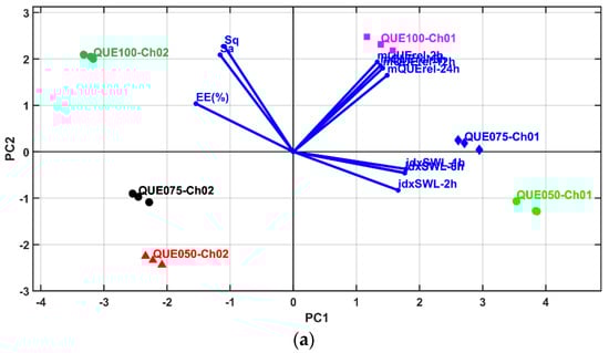 The multivariate statistical sequence begins with the PCA method, which generates the principal coordinates (PC1–PC11) of the studied parameters for all of the microspheres (i.e., the QUE and Ch combinations). The principal coordinates PC1 to PC2 cover 98.99% of the cumulative explained variance.