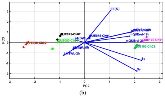 Biplots of PCA results: (a) 2D representation for PC1 and PC2 principal components; (b) 2D representation for PC2 and PC3 principal components.