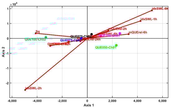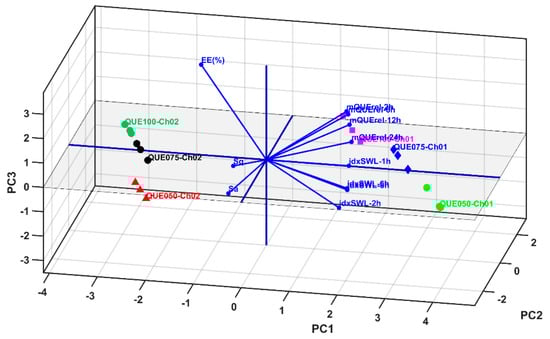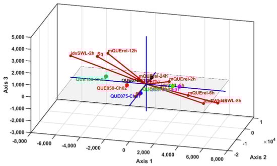The PCA 2D and 3D biplots (Figure 16a,b and Figure 17) display the variable vectors, indicating the direction in which the corresponding variables have the highest abundance or concentration values. Additionally, the samples are also displayed; thus, in this way, PCA consists of an ordination multivariate statistical method that generates relative comparisons between the studied samples on the basis of their parameter values. Furthermore, the initial idxSWL and mQUErel Sample * Time levels was shortened to mQUErel_2 h, mQUErel_6 h, mQUErel_12 h, mQUErel_24 h, idxSWL_1 h, idxSWL_2 h, idxSWL_6 h, idxSWL_8 h. The reason for this was the presence of strong correlations between Time levels, and for each parameter; thus, redundant information could corrupt the PCA biplots, scores, and loadings.