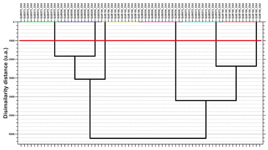 Cluster analysis of MANOVA (p = 0.05) results: dendrogram representation for principal coordinates of PC1 ÷ PC11 with the cut-off red line used to generate the clusters. Different colors for groupsing of horizontal lines denote sample clusters.