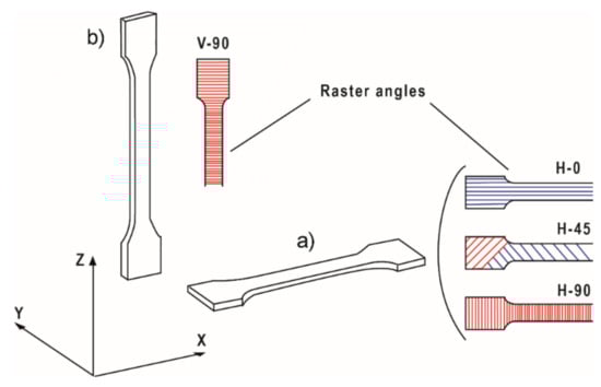 Orientations and raster angles of the different tensile test specimens. (a) Horizontal orientation, with raster angles parallel to the building axis, X, (0°, H-0), ±45° (H-45), and perpendicular (90°, H-90); (b) vertical orientation with the raster angle perpendicular to the building axis, Z, (V-90).