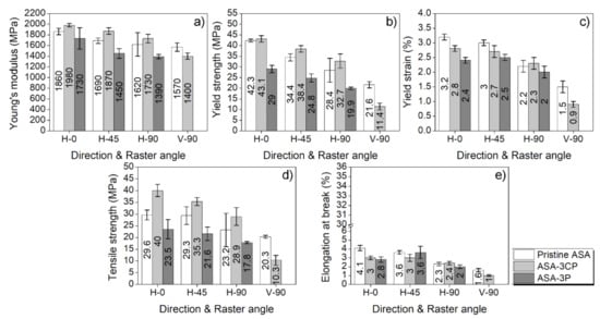 Both fillers were tested to check out the behaviour of the composites when processed by FFF. The mechanical properties of ASA-3CP and ASA-3P composites printed by FFF in several orientations and raster angles (see Figure 1) are shown in Figure 3. The corresponding stress–strain curves have been included in Figure S2 as Supplementary Material.
