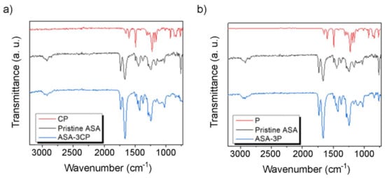 ATR spectra of (a) CP, pristine ASA, and ASA-3CP, and (b) P, pristine ASA, and ASA-3P.