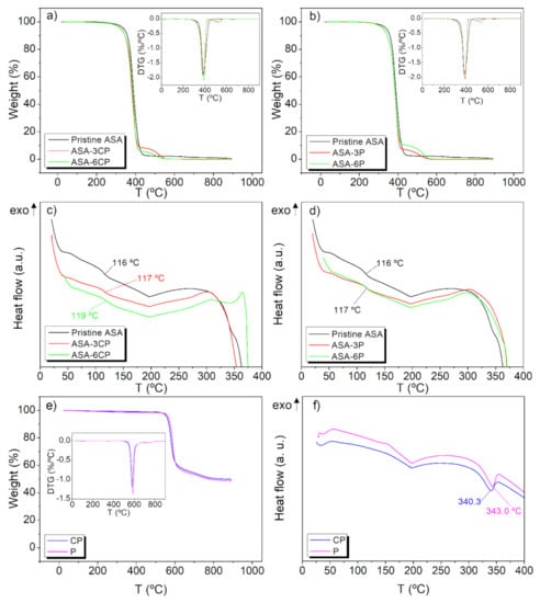 TGA thermograms of pristine ASA and (a) ASA-CP composites, and (b) ASA-P composites, (the corresponding DTG curves are included, respectively, in the insets); DSC curves of pristine ASA and (c) ASA-CP composites, and (d) ASA-P composites; (e) TGA thermograms of CP and P (with the corresponding DTG curves in the inset), and (f) DSC curves of CP and P.