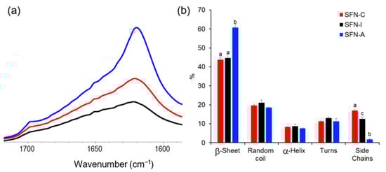 ATR-FTIR analysis of the secondary structure of the silk fibroin nanoparticles. (a) amide I region of the ATR-FTIR spectra of non-sterilized (SFN-C, red), gamma irradiated at 5 kGy (SFN-I, black), and autoclaved (SFN-A, blue) SFNs; (b) Secondary structure assignation obtained by Fourier self-deconvolution of the amide I peak. Different letters in the same group indicate significantly different subsets (p < 0.05).