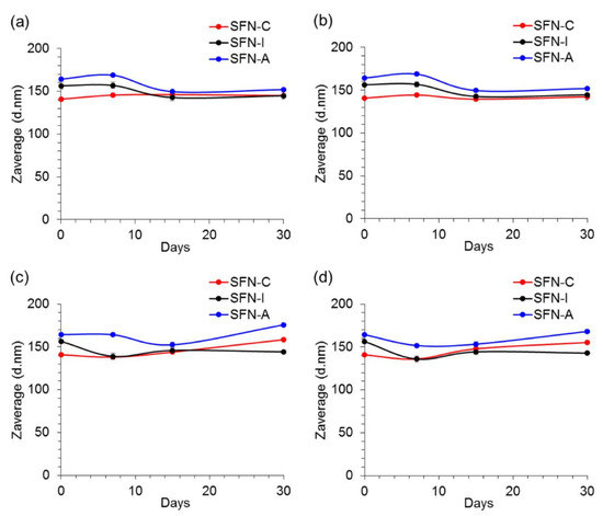 Effect of incubation temperature and aqueous media composition on the evolution of the hydrodynamic size (Z-average) of the non-sterilized (SFN-C, red), autoclaved (SFN-A, blue), and gamma irradiated at 5 kGy (SFN-I, black) nanoparticles for 30 days in: (a) Ultrapure water, 4 °C; (b) ultrapure water, 37 °C; (c) PBS 1× pH 7.4, 4 °C, and (d) PBS 1× pH 7.4, 37 °C. Values presented as Z-average (d.nm) ± SD (N = 9).
