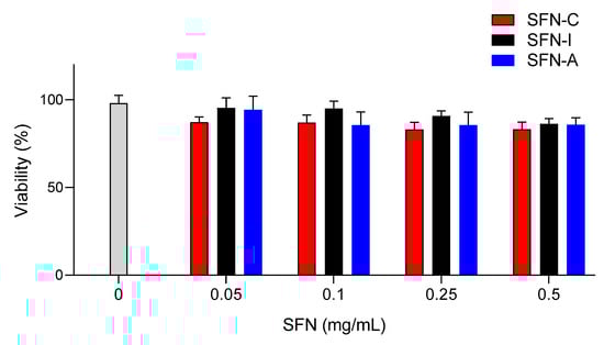 The cytotoxic effect of the sterilized nanoparticles (SFN-I and SFN-A) on murine fibroblast viability was evaluated and compared with the non-sterilized nanoparticles (SFN-C). The selection of the L929 cell line for the cell viability/cytotoxicity assays was based on previously developed similar experiments [10,36], but the range of the concentrations assayed was increased to 0.5 mg/mL in order to cover future applications with a higher concentrations of nanoparticles. The mean value of the absorbance of the controls without nanoparticles was assumed to be 100% viability after 24 h of incubation (see Figure 5). No significant differences were found between the cell viability of the controls and that of the cells incubated with SFNs at concentrations in the range of 0.05–0.500 mg/mL.