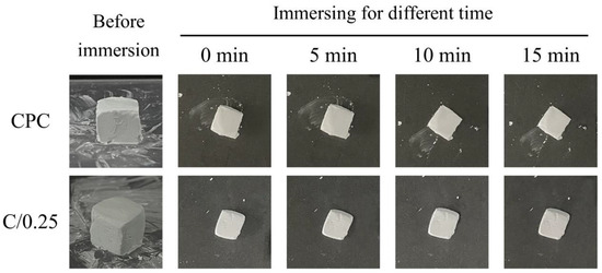 After the slurry of the C/0.25 composite was mixed, the C/0.25 composite was molded by hand to ensure that its plasticity allowed for it to be molded into the desired shape. After 5 min of mixing, the mold sample was placed in a container filled with water, and a photo was taken to observe the debris or sample collapse around the CPC-only and C/0.25 composite.