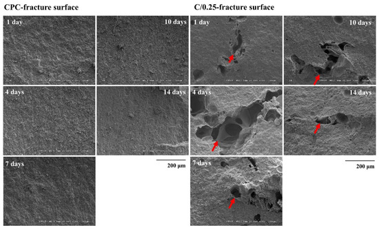 Microstructure analysis of fracture cross-section of CPC-only and C/0.25 composite at multiple immersion time points (arrow indicates hydrogel beads in CPC).