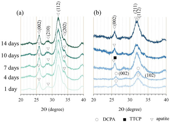 After the CPC underwent an immersion reaction, its component phase transformed into a product phase that was mainly composed of hydroxyapatite (HA), and no diffraction peaks of the dicalcium phosphate anhydrous (DCPA) and tetracalcium phosphate (TTCP) formed after CPC-only immersion was observed (Figure 3a). The composition analysis of the C/0.25 composite at multiple immersion time points revealed that the diffraction plane of DCPA/(002) at 26.367° could be seen in the early stage of the reaction (Figure 3b). As the calcium cations in the alginate and gelatin-mixed hydrogel were combined with carboxyl groups, apatite crystals grew and precipitated in the hydrogel matrix through the preferential directional diffusion of phosphate anions. In particular, the planes of apatite diffractions corresponding to (211) and (112) increased, and the (210) plane of the apatite reduced [36]. When the immersion time increased, the diffraction peaks of DCPA disappeared and were replaced by the diffraction planes of apatite/(002) at 25.689° and apatite/(112) at 31.795° and 32.066°. After 7 days of immersion, the diffraction peaks of apatite gradually became dominant. The addition of hydrogel beads delayed the phase change of the CPC matrix; nevertheless, the final XRD phase of the C/0.25 composite was still converted into a product phase dominated by HA without the (210) plane after 14 days of immersion. The results showed that the interaction between the carboxylic acid of gelatin and the calcium cation of apatite can guide the growth of apatite with specific (211) and (112) planes (Figure 3).