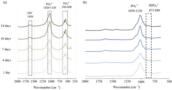 The characteristic absorption of the CPC functional group was mainly located at 560–600 cm−1, 1020–1120 cm−1, and 1650 cm−1. The typical vibration bands of PO43− in the HA structure were observed at 560–600 cm−1 and 1020–1120 cm−1, and the stretching band of OH− was observed at 1650 cm−1 (Figure 4a). For the C/0.25 composite, the absorption band at 875–880 cm−1 indicated the presence of HPO42−, but no obvious characteristic band of OH− was observed at 1650 cm−1. From the above XRD results, it can be seen that there was an interaction between the polar functional groups (such as carboxyl, carbonyl, and amino) in the hydrogel and the inorganic phase (DCPA, TTCP, and apatite) to control the nucleation of apatite, thereby changing the preferred orientation in the orderly growing crystal. Therefore, the FTIR spectrum of the C/0.25 composite was different from that of the CPC-only. A study reported that the effect of the combination of polysaccharide or gelatin in CPC on the crystallinity of CPC was minimal [37]. However, another study revealed that gelatin accelerated hydraulic reactions of CPC paste, in which reactants were immediately converted into nanostructured apatite precipitates after hardening [35]. Gelatin molecules induced 4–10% macropores (10–300 μm) in the cement structure and decreased the initial setting time by approximately 190%. The composition analysis using X-ray diffraction (XRD) indicated that the final product phase was mainly related to the bone cement that was used. In the present study, the addition of hydrogel beads slightly delayed the phase transition of CPC. After 7 days of soaking, the composition of the raw materials could still be observed; however, the final product phase was still converted into apatite; this result is identical to that obtained through a single CPC reaction.