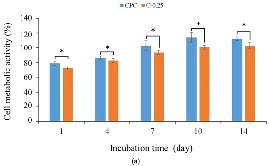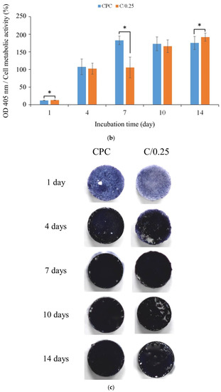 Figure 6a shows the quantitative results of the long-term proliferation of D1 cells in CPC-only and C/0.25 composite materials. The results showed that with the extension of the culture time, cell proliferation led to an increase in cell metabolic activity. When D1 cells were cultured in CPC-only and C/0.25 composite after 7 days as an early sign, the cell metabolic activity gradually reached a plateau (Figure 6b). Compared with the control group, the cell metabolic activity of each group exceeded 70%, indicating that it did not cause cytotoxicity. Only the cell metabolic activity of the CPC-only and C/0.25 composite did not increase significantly on the 7th day. In the CPC-only and C/0.25 composite, the cell metabolic activity continued to increase until day 10, plateaued on day 14, and did not exhibit a downward trend. Despite the trend being the same, the cell metabolic activity of the CPC-only was higher than that of the C/0.25 composite at all culture time points.