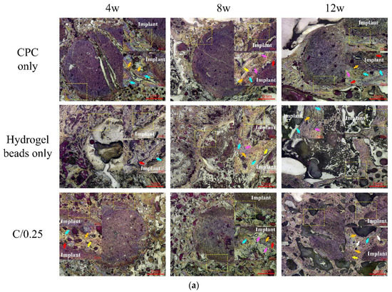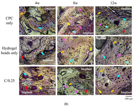 Eight weeks after the hydrogel beads were implanted, a clear interface was obvious, and a gap was present between the implant and surrounding bone, which was verified to be soft tissue (Figure 7b). In the CPC-only and C/0.25 composite, no gap was observed between the implant and surrounding bone. In addition, numerous neatly arranged osteoblasts were observed, indicating that new bone was forming and bone regeneration was active. The reduction in the planting area of the C/0.25 composite was greater than that of the CPC-only. By combining the hydrogel beads into the CPC matrix, the absorption of the implant material was promoted, which may explain why fewer residual implants were observed.