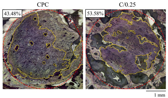 A quantified absorption rate of CPC-only and C/0.25 composite after 12 weeks of implantation (red dotted line indicates an original bone defect, which is a circular implant with a diameter of 4 mm; yellow range indicates the area of the residual implant, and the number indicates absorption).