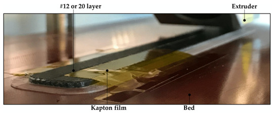 The DCB specimens for the characterization of the mode I fracture toughness were printed according to the ISO-15024 standard [50]. Two different thicknesses were considered for the specimens’ arms to capture the effect of this thickness in the measure of the fracture toughness. The thickness of the arm for the thin specimens, DCB-A, was set to 1.5 mm (3 mm in total), while for the thick specimen, DCB-B, it was set to 2.5 mm (5 mm in total). To generate the starter crack at the specimen’s midplane, once the bottom half was fully printed (after layer 12 and layer 20 for the DCB-A and DCB-B specimens, respectively), the printing process was paused. Then, a film/tape was laid on top of the appropriate area and fixed to the printer bed. In a first attempt the typical PTFE film used in composite materials was used. However, the results were not correct because the heat of the printer head generated several wrinkles in the PTFE film resulting in imperfections in the top part of the specimen (waviness and fiber misalignment) and obstructions in the printer head. In a second attempt, adapting the procedure used by Fonseca et al. [43] an adhesive Kapton® tape and a holding support were used but with unsatisfactory results. The adhesion between the Kapton® tape and the deposited CF/PA filament resulted to be unsatisfactory (the adhesion with pure PA filament was correct). Besides, it was not possible to achieve enough tension in the tape using the holding support, which resulted in waviness and fiber misalignment. Hence, the adhesive Kapton® tape was laid on top of the bottom half of the specimen and fixed to the printer bed face-up (adhesive part on top) with an auxiliar tape. An additional area without film beyond the pre-crack area was left to ensure good adhesion. It was possible to achieve the necessary tension in the tape and avoid wrinkles and fiber waviness (see Figure 1 and Figure 2) while the printed carbon fiber filament bonded to the tape. Obviously, the additional area without film had to be removed/cut before testing, as it would prevent the propagation of the crack.