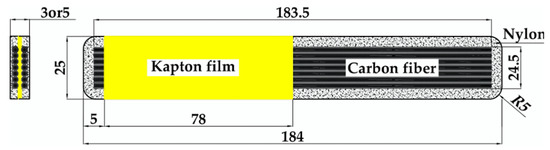 The nylon cover of the specimens was not removed after the manufacturing process to simplify their post-processing and for being more representative of a possible printed part. Although the influence of the nylon cover is minor with respect to the carbon fiber reinforced layers (especially in the case of the longitudinal specimens), it was not taken into account during the analysis of the experimental data and only the cross-section of the CF/PA material was considered. To prevent the moisture absorption of the nylon and avoid any possible influence on the experimental results [47,48,49], after manufacturing all the printed specimens were stored inside a dry-box with several desiccant bags at room temperature until they were instrumented and tested.