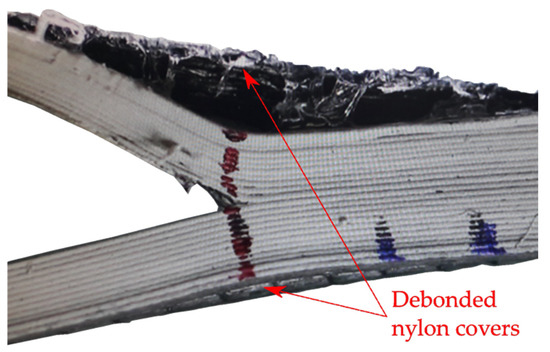 Close-up of the crack tip area of a DCB-A specimen showing the debonding of the nylon covers from the rest of the specimen.