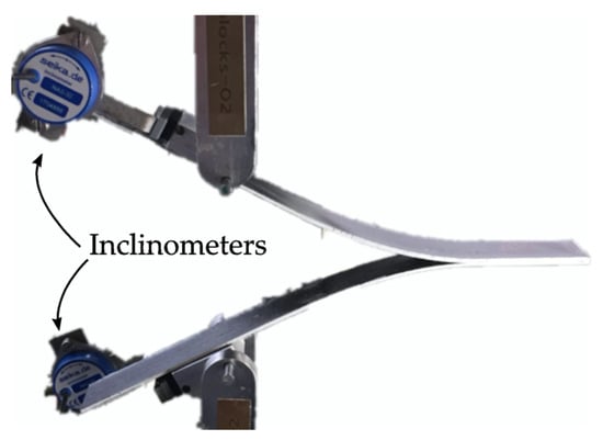 All the interlaminar fracture tests were carried out using an MTS (Eden Prairie, Minnesota, MN, USA) Insight testing machine equipped with a 5 kN load cell at 23 ± 2 °C and 50 ± 5% HR. The cross head speed was set to be 5, 1 and 1 mm/min for the DCB, ENF and C-ELS tests, respectively, for loading and 25, 10 and 10 mm/min for unloading. In all the cases, before the real test, the initial pre-crack from the Kapton® adhesive tape was extended between 3 and 5 mm in mode I, using the DCB tests to avoid any possible effect of the tape and ensure the initiation from a sharp crack tip. During all tests, force and displacement signals were recorded, as well as the signal from the inclinometers in the DCB tests. The crack propagation was tracked and recorded using a high-resolution video camera for the both DCB and C-ELS specimens. The crack propagation was not monitored for the ENF tests because it is typical for this type of test that the propagation is unstable, growing instantaneously from the pre-crack to bellow the load roller, where it is arrested. Figure 4 shows a DCB-A specimen during the test with the loading blocks and the inclinometers. As it can be seen in the image, the opening of the arms is totally symmetric and with the typical deformed shape under bending.