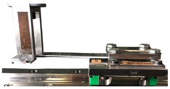 Prior to perform the C-ELS tests, a clamp calibration was performed at 50, 60 and 70 mm length, as indicated in the standard. Hence, the specimen flexural modulus (Ef) and the C-ELS clamp correction were obtained to use the CBTE reduction method [51]. During the test, the un-cracked end of the sample was fixed to the sliding clamping system of the test apparatus so it could move horizontally when a vertical displacement was applied to the loading block on the bottom surface of the specimen at the cracked end, as shown in Figure 5.