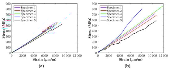 The stress-strain curves of the longitudinal tensile tests obtained with the D638 and D3039 specimens are shown in Figure 6. For the D638 specimens, Figure 6a shows that the stress state increases linearly with the applied strain up to around 6000 μm/mm. At this strain level a sudden strain change, probably due to a stress concentration in the area of the fillet, can be observed for all the specimens. After this point, the stress level in the specimens continues increasing with the strain until the final abrupt failure at maximum tensile stress, as expected for this type of material. The stress-strain curves for the longitudinal ASTM D3039 specimens using paper end-tabs are presented in Figure 6b. Although in two cases the corresponding curves show a strange behavior (probably due to an error in the extensometer), the stress level increases linearly with the applied strain until a final brittle failure occurs, as for the D638 specimens. Indeed, the stress curve for Specimen 4 experienced a smooth increment at around 4500 μm/mm, as if a stiffening process was present in the specimen. With respect to Specimen 5, the entire experimental data exposed a peculiar performance, which can be attributed to a problem with the strain transducer. Therefore, these two specimens were not taken into account during the data reduction process to determine the longitudinal in-plane properties of the material with the D3039 specimens.