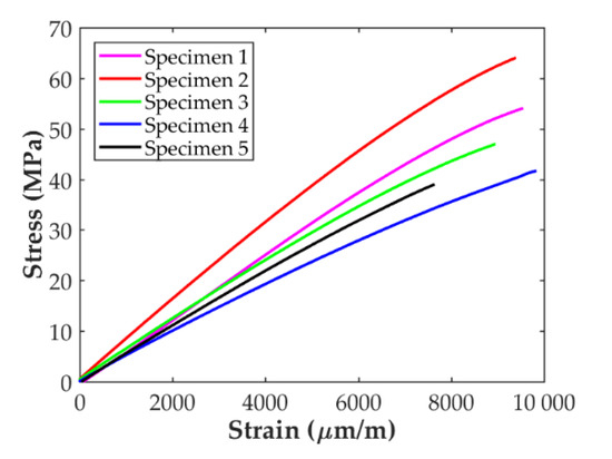 The stress-strain curves for the five D638 specimens tested in the transverse direction are presented in Figure 7. As for the longitudinal specimens, the stress increases almost linearly with the applied strain for all the samples until brittle failure occurs. All the curves follow the same trend except for one, Specimen 2, in which the slope of the linear part of the curve and the level of maximum stress is higher than for the rest.