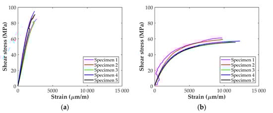 In-plane shear strain-stress curves: (a) ASTM D638 and (b) ASTM D3039 specimens.