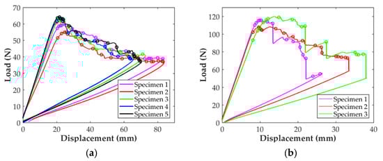 Load-displacement curves for the (a) ENF specimens and (b) C-ELS specimens. Marks correspond to the different crack propagations indicated in the standard.