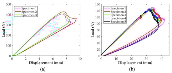 The mode II load-deflection curves of the three ENF specimens and the five C-ELS specimens are shown in Figure 10. All curves for each specimen type exhibit the same trend with good repetitiveness: load increases linearly with the applied displacement almost up to the peak load. After this point, the load tends to decrease in the typical non-linear trend, until the test was stopped for the ENF specimens, Figure 10a, and until the end of the propagation marks for the C-ELS ones, Figure 10b. As it normally occurs for the ENF test, the crack propagated in a rapid and unstable way until it was located under the load roller and the test was stopped. For this reason, only the initiation value of GII was determined for the ENF test. Crack propagation was continuous and smooth for C-ELS specimens and both initiation and propagation values were determined.