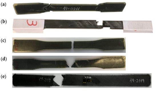 Comparing the results shown in Figure 6 and Table 3, it can be seen that the value of the longitudinal modulus and the strength are higher for the D3039 specimen, 16% and 42% higher, respectively. Thus, it can be considered that, in terms of the characterization of the elastic behavior, both specimens are similar. However, the stress concentration generated in the fillet of the D638 specimens combined with the fact that the 3D printer starts and ends the deposition of the carbon filament in this area results the premature failure of the specimen. Similarly, the stress loss shown in Figure 6a for all the D638 specimens before the final failure (between 6000 and 7000 μm/mm of axial strain) can be attributed to the same. This explains why the failure for all the D638 specimens was located at the fillet area and outside the gauge length, as shown in Figure 11a. A similar observation was previously reported in the literature [5,14,15,29]. On the contrary, the prismatic geometry of the D3039 specimens with paper end-tabs, as suggested by Pyl et al. [29], improves the load transfer between the testing machine and the specimen, reducing the stress concentration in the clamping area. This is why the level of maximum stress is higher for all the D3039 specimens and all failures were located at the gauge length with lateral fracture, as shown in Figure 11b. Consequently, the two test configurations are equivalent for the determination of the axial modulus in the longitudinal direction but for the determination of the tensile strength and ultimate strain it is better to use ASTM D3039 specimens with paper end-tabs.