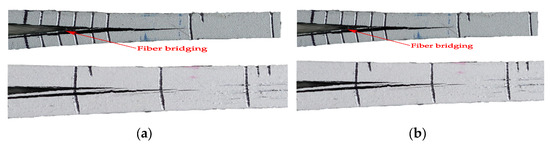 Close-ups of the crack tip areas during tests with details of the delamination extension: (a) DCB-A specimen with fiber-bridging and crack branching and (b) DCB-B specimen with crack branching and jumping and propagation of multiple cracks.