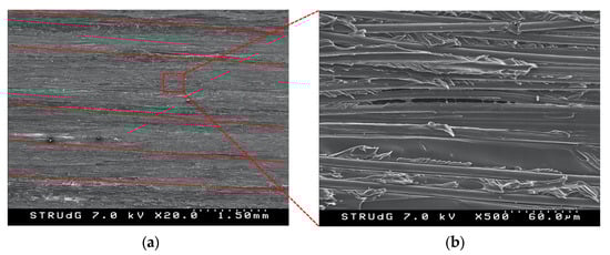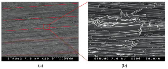 SEM images of a C-ELS fracture surface: (a) regular surface with deposited carbon fiber beads and longitudinal furrows and (b) close-up with evident matrix shear fracture.