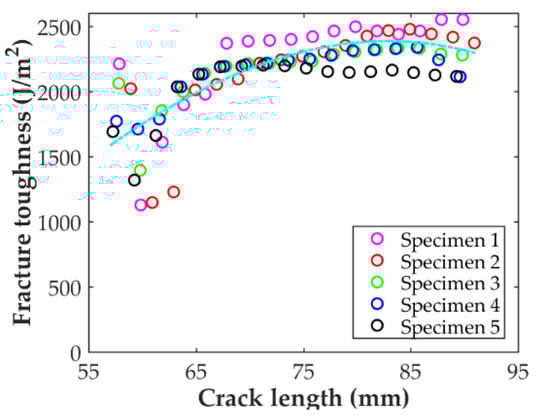 The crack propagation resistance curve, R-curve, for the DCB-A samples is shown in the Figure 14. It is seen that the curve tends to increase for short and long crack lengths but remains constant for the central range of values. For crack lengths between 60 and 90 mm, the fracture toughness value is fairly constant and in good agreement with the average propagation value reported in Table 4, 1720 J/m2. A similar tendency for the R-curve was reported by Iragi et al. [27] for the same material.