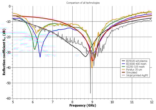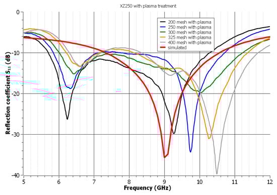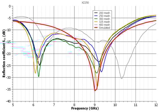 In Figure 2, the impact of the mesh of the used screens on the UWB antenna’s reflection coefficient is illustrated using the screen-printing paste XZ250. The worst results were obtained with 200 mesh due to the lowest attenuation. The best results in terms of resonance frequency and high attenuation were obtained when 325 mesh was used. The 400 mesh showed a significant shift in resonance frequency. Although the resonant frequency has been slightly moved to 9.15 GHz, the reflection coefficient is nearly identical to that of the simulated curve. The observed improvement in the measured S11 parameter was achieved when the mesh was increased from 200 to 325. According to the datasheet for the examined paste, the manufacturer recommends mesh sizes ranging from 124 to 228 (49–90 T/cm), which is much less than the mesh sizes used in the experiments. A smaller mesh size limits the creation of precise structures, but it is ideal for printing pastes with a higher viscosity and larger particles. Although a larger mesh is better for printing accurate structures, strict requirements for the rheological properties of the applied pastes exist. However, it has been demonstrated that this paste is suited for higher meshes, with results demonstrating that it is applicable up to 325 mesh and increases the quality of printed structures.