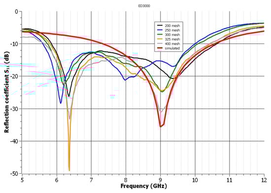 In the case of the second analyzed polymeric paste, ED3000, the best result was obtained when a screen with a mesh size of 400 was used. The realized antenna’s bandwidth was increased to 3.8 GHz from 6.6 to 10.4 GHz. On the other hand, as illustrated in Figure 4, the mesh of the used screens had the biggest impact on the antenna’s reflection coefficient. Meshes 200 and 250 cause the shift in the resonance frequency and an insufficient reflection coefficient. Meshes of up to 300 cause the UWB antenna’s resonant frequency to stabilize and the reflection coefficient to decrease in accordance with the simulated curve. The manufacturer recommends a mesh size range of 200 to 325 for stainless steel screens. The results demonstrate that increasing the mesh size also improves the quality of the printed structure in this context.