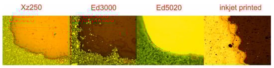 The reflection coefficient of the materials chosen to provide the best solutions is illustrated in Figure 8. As is obvious, the inkjet-printed UWB antenna has the highest reflection coefficient. It is necessary to keep in mind that the principle of inkjet printing technology is based on a drop-by-drop system, which results in the printed structure’s regular edges [], as illustrated in Figure 9. Smooth or regular edges are critical in the HF area due to the uniform wave reflection. Additionally, inkjet printing technology allows precise printing. This technology’s combination of these two advantages makes it the most suitable for the realization of UWB antennas [,]. Despite the shift in resonance frequency, graphene-based materials also provide an attractive solution for the implementation of UWB antennas due to their wide BW. However, in the case of the paste ED5020, it is critical to match the design to the paste’s low spreading characteristics or plasma treat the polymeric substrate’s surfaces. Both polymer-based screen-printing pastes containing silver particles are appropriate for realizing UWB antennas; nevertheless, it is imperative to analyze the effect of the screen mesh on the final quality of the UWB antenna. Polyimide substrates coated with a copper layer, called Pyralux, provide consistent quality in high-frequency applications. From a green electronics standpoint, this method is the least acceptable because of the hazardous wastes.