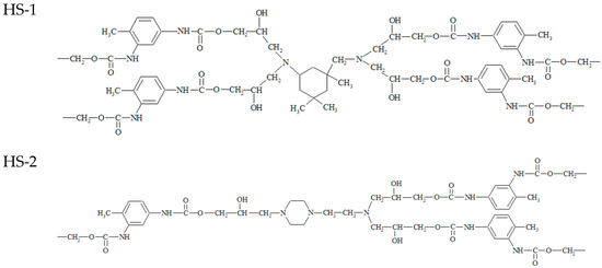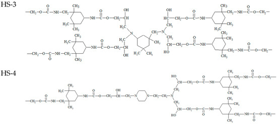 At the final synthetic step, epoxyurethane oligomers were mixed with a curing agent, isophorone diamine or aminoethylpiperazine, for 10 min under vacuum (1–2 kPa) at 90 °C. The resulting reaction mixture was cured for 48 h at 90 °C. Cure monitoring by FTIR was used to determine the required cure time. Disappearance of the absorption band at 910 cm−1 indicated the completeness of the epoxy group conversion [22]. Four types of hard blocks can be distinguished in the structure of these polymers, products of interaction of the synthesized oligomers and two types of amines (Figure 3):