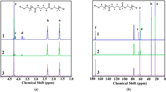 In the 1H spectrum, there are two peaks attributed to protons of methylene groups of the adipate fragment- at 1.65 (C(O)-CH2-CH2-CH2-CH2-C(O) (a)) and 2.33 (C(O)-CH2-CH2-CH2-CH2-C(O) (b)) ppm, respectively. Triplet signals at 3.78 (d) and 4.18 (c) ppm correspond to the protons of methylene groups of the terminal ethylene glycol fragment. The signal at 4.25 ppm (e) corresponds to the remaining protons of the ethylene glycol fragment. This NMR signal interpretation corresponds to the one reported in [26,27]. At the same time, integration of the 1H-spectra peaks showed the molecular weights of oligoethylene glycol adipates 1–3 to be different.