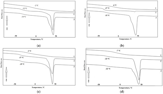 The thermal properties of the synthesized elastomers were studied by differential scanning calorimetry. First the samples were heated to 150 °C, then cooled to 100 °C below zero, kept for 30 min, and heated at a heating rate of 5 K/min. In Figure 5a–d the reheating thermograms of the samples K1–12 are shown. The thermophysical properties of the synthesized elastomers are shown in Table 4.
