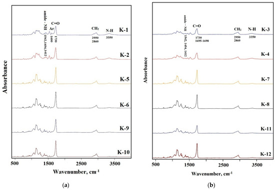 Figure 6. The FTIR spectra for the samples: (a) K–1, K–2, K–5, K–6, K–9, K–10; (b) K–3, K–4, K–7, K–8, K–11, K–12.
