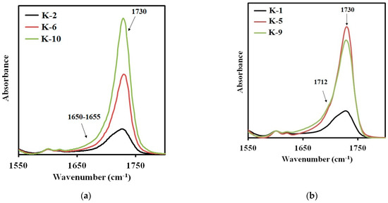 Figure 7. Sections of the FTIR spectra for the samples: (a) K–2, K–6, K–10; (b) K–1, K–5, K–9.