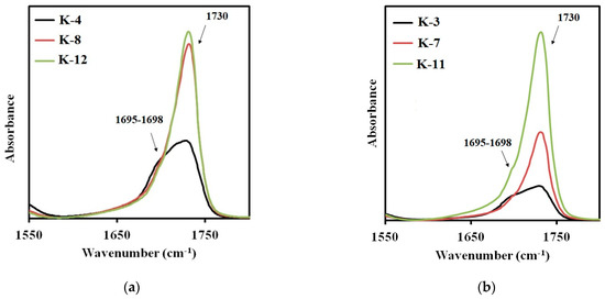 Figure 8. Sections of the FTIR spectra for the samples: (a) K–4, K–8, K–12; (b) K–3, K–7, K–11.
