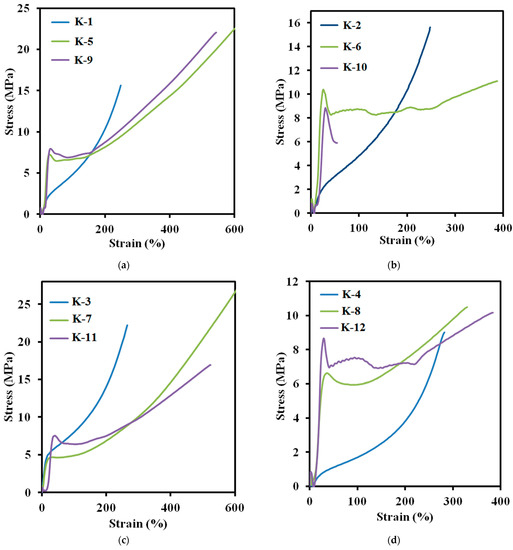Figure 9. Stress–strain curves of elastomer samples at 25 °C: (a) K–1, K–5, K–9; (b) K–2, K–6, K–10; (c) K–3, K–7, K–11; (d) K–4, K–8, K–12.