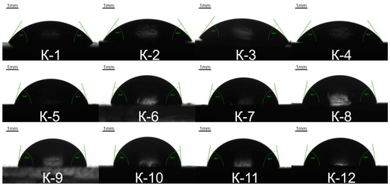 Figure 10. Contact angle of water for the elastomer samples K-1–K-12.