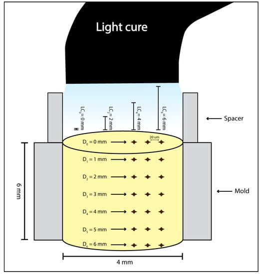 - Moore, B.K.; Platt, J.A.; Borges, G.; Chu, T.M.; Katsilieri, I. Depth of cure of dental resin composites: ISO 4049 depth and microhardness of types of materials and shades. Oper. Dent. 2008, 33, 408–412. [Google Scholar] [CrossRef]