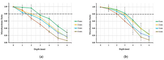 To determine the reduction of MH due to the increase in LC distance, absolute and relative reductions at each depth were calculated in relation to LC0. The absolute reduction in MH was calculated by subtracting the value at LC2, LC4, and LC6 from values at LC0. The relative reduction in microhardness ratio (MHR) was determined by calculating the percentage decrease in DC at each LC compared to LC0.