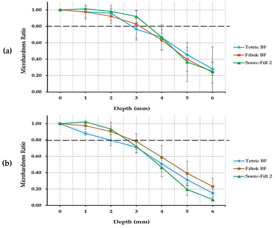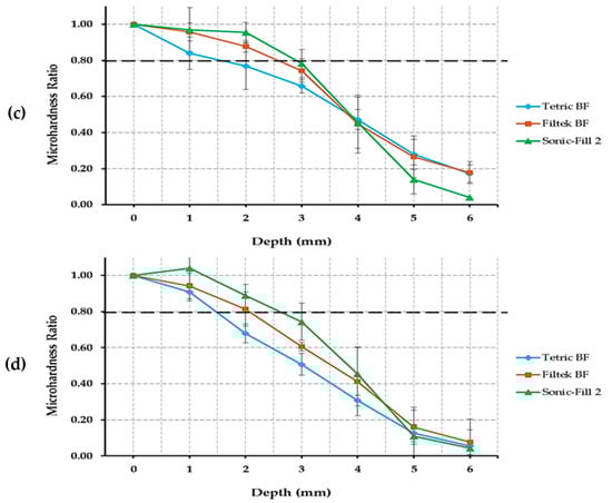 Line graphs showing microhardness ratio values of the different bulk-fill materials at different light cure distances: (a) 0 mm, (b) 2 mm, (c) 4 mm, and (d) 6 mm. Error bars represent standard deviations. Tetric N-Ceram BF was significantly different from Filtek One BF and Sonic-Fill 2 (p ≤ 0.05). Filtek One BF was non-significantly different from Sonic-Fill 2 (p > 0.05). Dashed lines represent acceptable microhardness ratio (≥0.8) according to Poggio et al. [21].