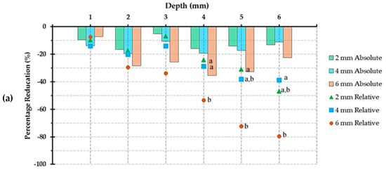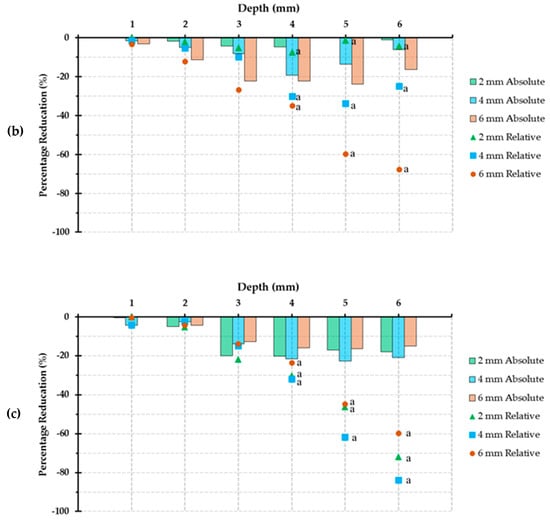 Bar graphs showing absolute reduction in microhardness ratio plus relative reduction in microhardness ratio (markers) compared to the same depth at 0 mm light cure distance for: (a) Tetric N-Ceram BF; (b) Filtek One BF, and; (c) Sonic Fill 2. The same letters indicate non-significant difference (p > 0.05) of relative reduction in microhardness ratio for a particular depth (showing values for 4, 5, and 6 mm depths).