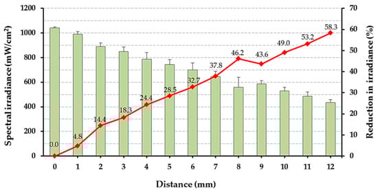 Spectral irradiance values (mW/cm2) for each distance (bars with error bars representing standard deviations) as well as percentage reduction in irradiance values (line with labels) compared to distance = 0 mm.