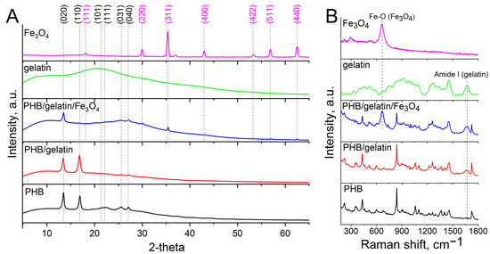 Structure, phase composition and other properties of pure and composite scaffolds were studied by XRD, Raman spectroscopy, XPS, and DSC. Figure 2A shows the XRD results on the structure and phase composition of the electrospun scaffolds. The obtained diffraction patterns of PHB scaffolds clearly show the main characteristic peaks of the crystalline phase of PHB, observed at 2θ values of 13.6° (020) and 16.9° (110). The sample also contains the peaks at 21.4° (101), 22.4° (111), 25.5° (031/130), 26.9° (040) assigned to the planes of the α-phase of PHB (ICDD PDF card No. 00-068-1411). The pronounced peaks observed for hybrid PHB/gelatin/Fe3O4 scaffolds at 2θ 18.2° (111), 30.4° (220), 35.9° (311), 43.5° (400), 53.5° (422), 57.7° (511), 63.1° (440), which correspond to the magnetite with face-centered cubic lattice [45]. When blended and electrospun PHB along with gelatin, the XRD patterns indicated a decrease in the crystallite size (from 31 nm in PHB and 27 nm in PHB/gelatin to 21 nm in PHB/gelatin/Fe3O4 for (020) plane) of the obtained composite scaffolds [36].